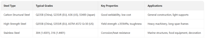 The base material aligns with global structural steel standards, selected based on strength and environment: